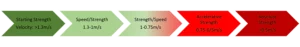 Accelerative Strength: Bar speed 0.5 m/s – 0.75 m/s (60-80% 1RM) – relatively heavy load/moving slowly (emphasize concentric as fast as possible)