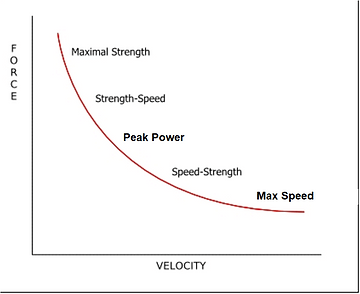 As force decreases, velocity increases. That’s why training for maximal or absolute strength looks different than training for maximum speed. However, with training and as an athlete becomes more proficient in their movement patterns, this curve can make a shift to the right with improvement in all areas.